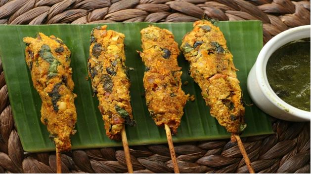 Instructions 1.Grind all the ingredients in a mixer grinder. 2.Add bread crumbs to make a semi solid consistency 3.Oil the skewers, put the mixture ...