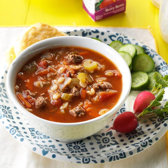 Instructions In a large saucepan, cook beef and onion over medium heat until meat is no longer pink; drain. Stir in the tomatoes, broth and water. Bring to a boil. ...